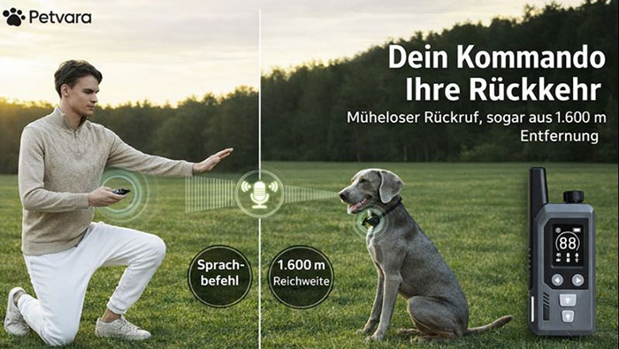 Wie gelingt Rückruftraining, wenn Entfernung und Ablenkung dazwischenfunken Petvara Hundehalsband ist für Situationen gebaut, in denen klassische Kommandos im Lärm der Stadt verpuffen oder im Gelände schlicht nicht mehr ankommen. Die Herausforderung liegt selten im fehlenden Willen, sondern in der fehlenden Timing Präzision. Korrektur oder Bestätigung kommen zu spät, der Hund lernt die falsche Verknüpfung, die Nerven liegen blank. Genau hier setzt ein System an, das Kommunikation über Distanz stabil hält und Grenzen klarer macht. Bildquelle: Petvara Der Ansatz ist bemerkenswert bodenständig. Keine Jagd nach Kartendaten, kein Dauertracking als Selbstzweck, sondern zuverlässige Steuerung in dem Moment, in dem Verhalten entsteht. Wer Rückruf, Abbruch und Orientierung sauber aufbauen will, braucht Verlässlichkeit, nicht Theater. Produktidee: Kommunikation statt Geschrei, Konsequenz statt Chaos Im Kern ist das Petvara System eine Kombination aus Empfängerhalsband und Fernbedienung, ausgelegt für Training und Sicherheit über größere Distanzen. Der Fokus liegt auf der unmittelbaren Rückmeldung, weil Lernen bei Hunden stark über Timing funktioniert. Wird ein Signal zu spät gesetzt, landet es nicht beim Auslöser, sondern bei irgendeinem Folgeereignis. Das Ergebnis sind Missverständnisse, die draußen schnell zum Risiko werden. Petvara positioniert sich als Haustier Technologie Marke, die auf stabile Funkkommunikation und klare Steuerung setzt. Das ist eine bewusste Abgrenzung zu Lösungen, die primär auf Ortung bauen. Ortung kann hilfreich sein, ersetzt aber keine präzise Verhaltensführung. Die wichtigsten Funktionen im Überblick Sprachsteuerung für direkte Anweisungen in Echtzeit, Reichweite laut Hersteller bis zu 488 Meter Virtueller Zaun mit einstellbarer Reichweite, laut Hersteller bis zu 975 Meter Trainingsmodi mit Piepton, Vibration und optional statischem Feedback, fein justierbar Wasserdicht nach IPX8, ausgelegt für Regen, Schlamm und Wasser Keine Abogebühren, Funktion ohne monatliche Zusatzkosten Bildquelle: Petvara Sprachführung: Warum die eigene Stimme im Training einen Unterschied machen kann Viele Systeme arbeiten mit Pieptönen oder Summen. Das ist praktisch, aber emotional neutral. Petvara ergänzt diese Ebene durch Sprachführung. Der Gedanke dahinter ist simpel. Eine vertraute Stimme kann Stress stabilisieren und Orientierung geben, besonders in unübersichtlichen Situationen. Es geht nicht darum, lauter zu werden, sondern klarer. Die Fernbedienung ermöglicht es, aus der Distanz direkt zu sprechen. Damit lässt sich ein Rückruf nicht nur als Signal, sondern als bekannte Handlungskette begleiten. In der Praxis kann das bedeuten, dass ein Hund schneller aus Ablenkung herauskommt, weil nicht nur ein Ton, sondern eine vertraute Ansage als Orientierung wirkt. Typische Einsatzszenarien Freilauf im Feld, wenn Wildgeruch und Distanz den Rückruf zerreißen Stadttraining, wenn Verkehrslärm und Reize Kommandos überdecken Unsichere Hunde, bei denen ruhige Führung mehr bringt als schrille Signale Aufbau von Abbruch und Umorientierung auf Distanz Bildquelle: Petvara Reichweite und Funktechnik: Stabilität ist wichtiger als Zahlen Herstellerwerte beeindrucken schnell, entscheidend ist jedoch die Konsistenz in realen Bedingungen. Petvara nennt für Sprachsteuerung eine Reichweite bis 488 Meter und für den virtuellen Zaun bis 975 Meter, abhängig von Umgebung und Bedarf. Technisch setzt das System auf SubGHz Funktechnologie mit bidirektionaler Verbindung, entwickelt für gleichbleibende Leistung auch in anspruchsvollem Gelände. Der Clou liegt in der Prioritätensetzung. Statt auf GPS oder netzwerkbasierte Dienste zu setzen, wird die Steuerungsgenauigkeit in den Vordergrund gestellt. Für Training ist das schlüssig. Rückruf und Abbruch brauchen keine Karte, sondern ein Signal, das zuverlässig ankommt. Laut Beschreibung entspricht die Funklösung EU-Sicherheits- und Funkvorschriften. Was das in der Praxis bedeutet Je weniger Technik zwischen Hand und Hund steht, desto besser ist das Timing. Funkbasierte Steuerung kann hier Vorteile haben, weil keine Mobilfunkabdeckung und keine App Stabilität als Engpass wirken. Gleichzeitig bleibt die Verantwortung klar beim Training. Technik kann unterstützen, aber keine Beziehung ersetzen. Bildquelle: Petvara Virtueller Zaun: Grenzen definieren, ohne Sichtkontakt zu verlieren Der virtuelle Zaun ist als Sicherheitsrahmen gedacht. Zwei Reichweiten lassen sich einstellen, 488 Meter oder bis zu 975 Meter. Wandert der Hund zu weit, startet eine intelligente Warnsequenz. Zuerst Piepton, dann Vibration, anschließend optional Korrektur. Sobald der Hund zurückkehrt, enden die Signale sofort. Das ist didaktisch wichtig, weil Ende der Einwirkung die richtige Entscheidung markiert. Warum diese Logik funktionieren kann Grenzen werden nicht über Strafe, sondern über Vorwarnung und klare Konsequenzen gelernt. Die Sequenz kann helfen, einen Rückweg zur sogenannten Heimatbasis aufzubauen. Entscheidend ist die saubere Einbettung. Der Hund muss verstehen, welche Bewegung das System beendet. Ohne Aufbau entsteht Verwirrung. Mit Aufbau kann ein verlässlicher Radius entstehen, der den Freilauf strukturierter macht. Einordnung für Training und Alltag Ein virtueller Zaun ersetzt keine Leinenpflicht und keine Umgebungskontrolle. Er kann jedoch als zusätzliche Sicherheitsebene dienen, wenn Freilauf verantwortbar ist. Im dichten Stadtverkehr bleibt Management wichtiger als Elektronik. Im Gelände kann der Zaun helfen, Distanz zu begrenzen, bevor ein Hund außer Reichweite gerät. Trainingsmodi: Von Erinnerung bis Korrektur, fein abgestuft Petvara wirbt mit über 100 anpassbaren Trainingskombinationen. Im Zentrum stehen strukturierte, progressive Modi. Drei Stufen für Piepton und Vibration sind für sanfte Erinnerungen gedacht, statisches Feedback kann optional zugeschaltet werden. Der entscheidende Satz ist der unspektakulärste. Wenn 